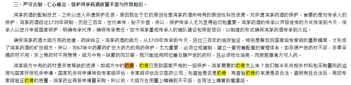 鴻茅藥酒配方中“豹骨”被質疑來源不明,回應稱“合法合規”_風聞