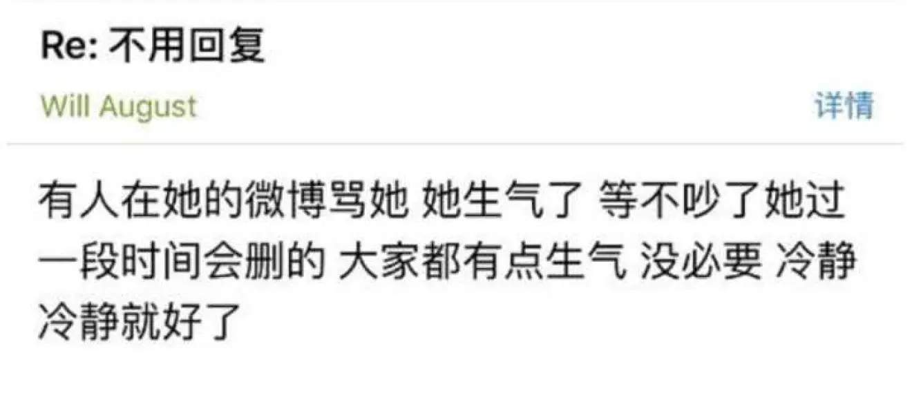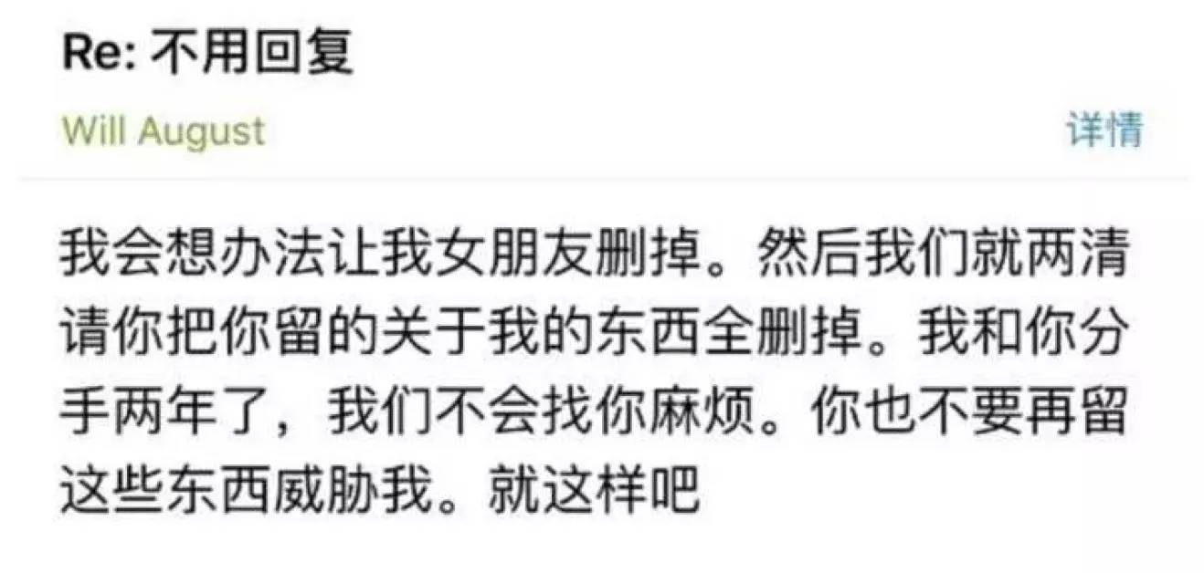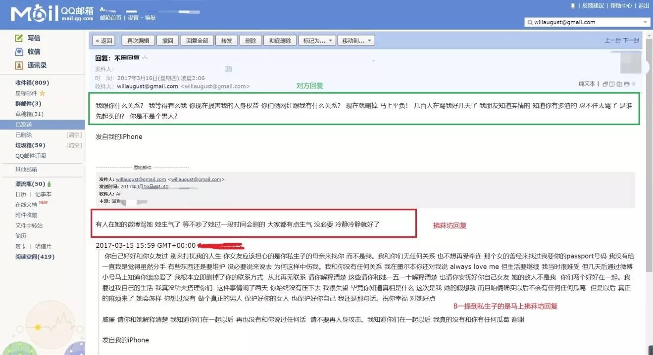 他們郵件中提到的這個猛料就是拂菻坊的私生子。當時那場網絡罵戰最後在猛料的威脅下結束了,拂菻坊最終刪掉了女友C對B的網絡暴力,拂菻坊回覆郵件如下:
