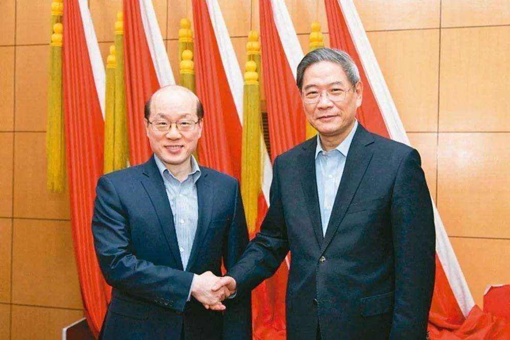 國台辦日前舉辦新舊主任劉結一(左)、張志軍交接,兩人面對鏡頭親切握手。(國台辦網站)