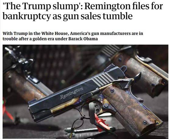 紐約州立大學槍支研究專家斯皮茨表示,美國主要槍械製造商均迎來了“特朗普蕭條”(Trmup slump)。由於特朗普上任期間,槍支暴力案件頻繁,美國社會要求嚴控槍支的意見不斷加強,各主要槍械廠商的銷量均出現斷崖式下跌。
