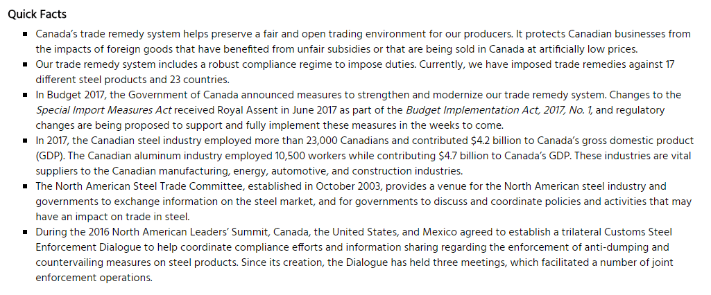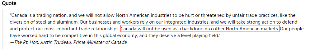 該聲明引述了加拿大總理特魯多的講話稱,“加拿大是一個貿易國家,我們不會允許北美工業由於不公平的貿易行為而受到傷害或是威脅,比如鋼鐵和鋁的轉運。我們的商業和工人依賴於綜合工業,將採取強有力的行動來捍衞和保護我們最重要的貿易關係。加拿大不會被作為北美市場的後門來利用。加拿大人民努力勞動、與全球經濟競爭,他們理應有一個公平競爭的環境。”