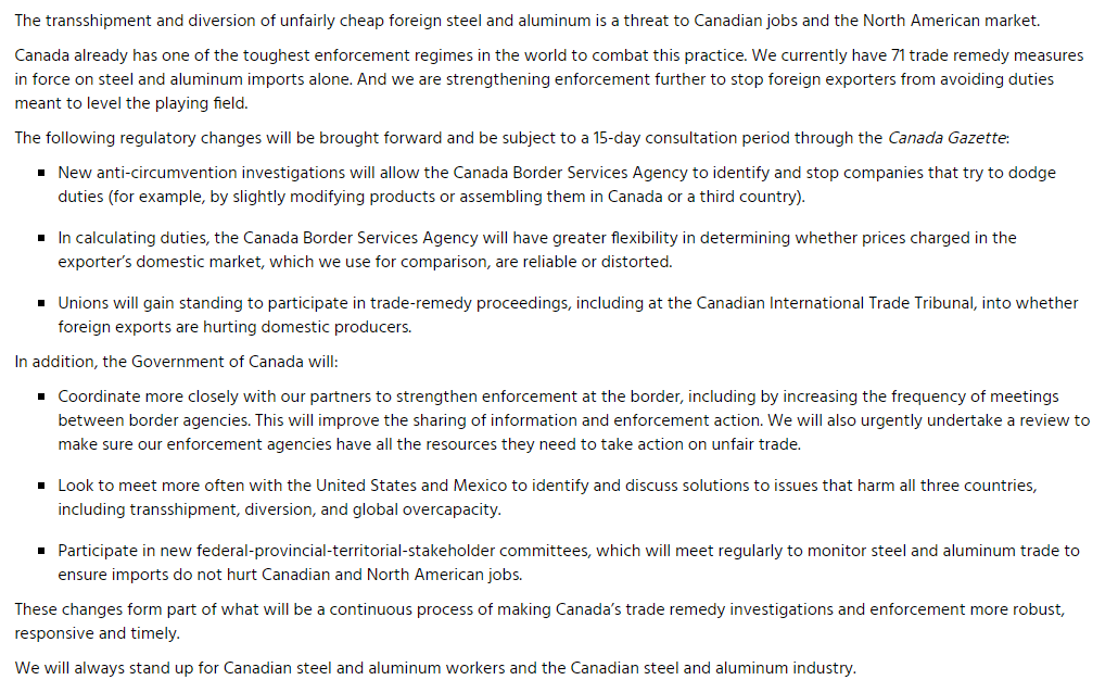 “加拿大為進一步防止鋼鐵和鋁的轉運轉移、以保護北美工人不受不公平貿易侵害而採取行動”,3月27日,加拿大總理辦公室發文