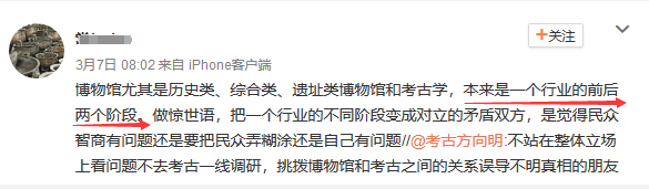 那還有一部分人的意見是,國博館長的這段提議顯然是與考古與博物的關係相違背。