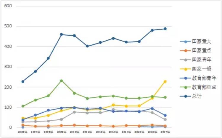 按照立項年份來看出,全國教育科學規劃課題立項數量呈逐年遞增態勢,2006年至2009年增幅尤其明顯,2009年之後增幅趨勢趨於平穩,其中2017年最多達到488項。從項目類型來看,國家重大課題近12年僅有14項、國家重點課題每年立項數在10個左右、國家青年課題每年立項數平均在70個左右、國家一般課題每年立項數平均在100個左右、教育重點課題每年平均在130個左右、教育部青年課題每年平均在90個左右。歷年立項趨勢詳見下圖1: