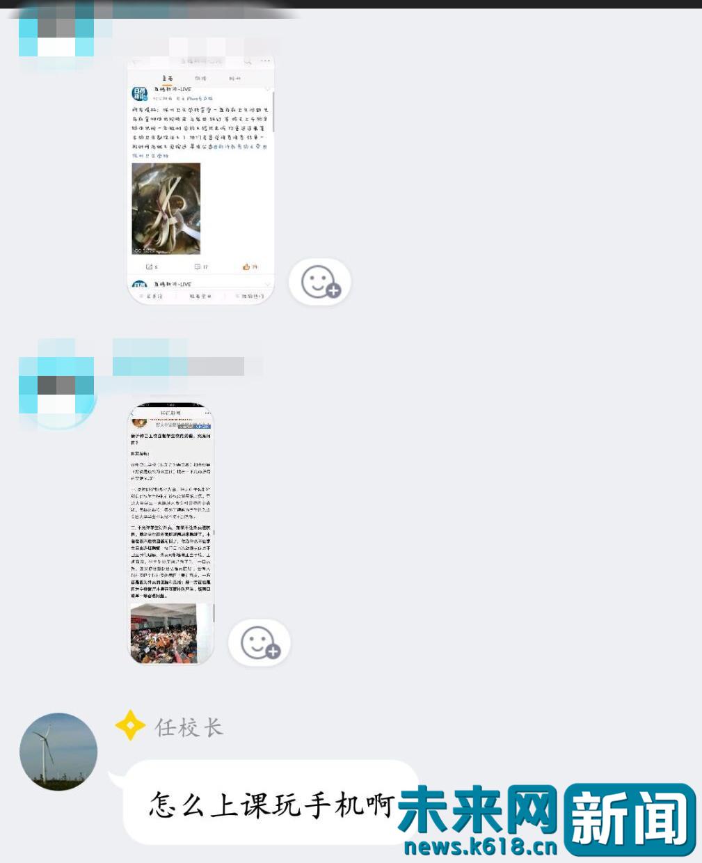 食堂衞生問題被曝光後,受訪學生告訴記者有人在學校羣中貼出了相關報道的截圖,而該學校的任校長隨後回覆該同學“怎麼上課玩手機啊”,對此,受訪學生表示並不理解校長關注的重點在哪裏。