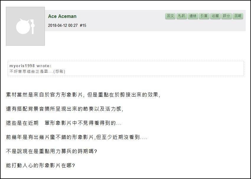 也讓一些台灣網民歡呼:募兵文宣材料找這短片的製作機構來處理,搞不好成效會更好。