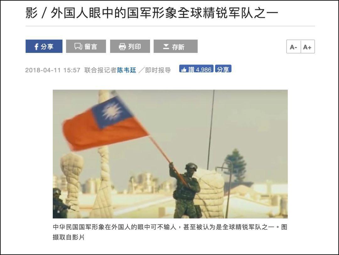 更不怪乎,台灣媒體在看到這則視頻後忽然有了一種“揚眉吐氣”的感覺稱,“‘國軍’形象近年來因虐狗、雄三飛彈誤射和集體吸毒等一系列事件一路下滑,但事實上,‘中華民國國軍形象’在外國人的眼中可不輸人,甚至被認為是全球精鋭軍隊之一。”