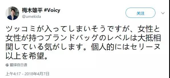 “吐個槽哈,我發現了一個問題,就是女性和她們拿的品牌包的等級是大抵相同的。
