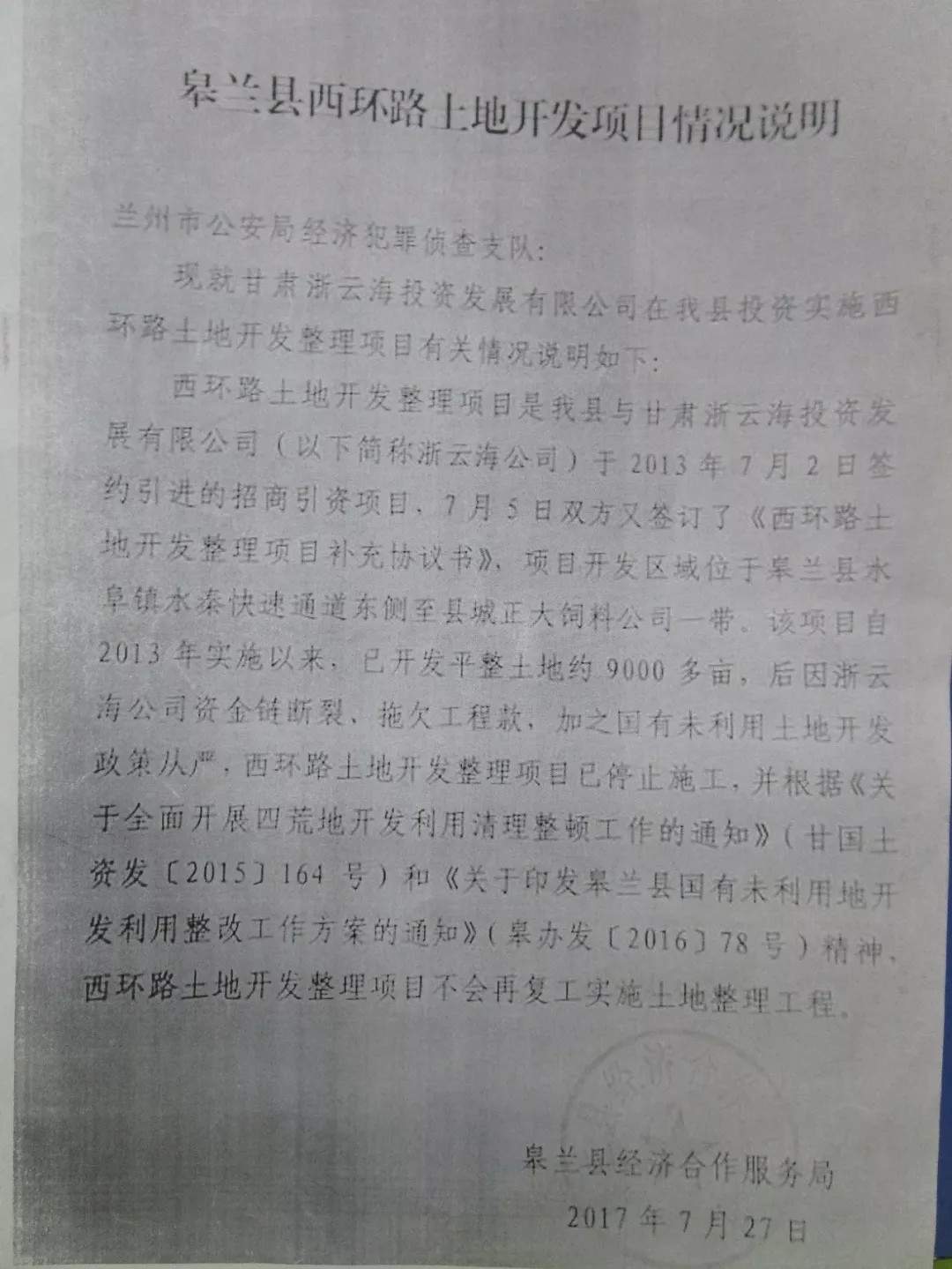 中國房地產報記者進一步調查時,獲取一份關於《皋蘭縣西環路土地開發項目情況説明》,這是“皋蘭縣經濟合作服務局致蘭州市公安局函件”,該函件顯示:西環路土地開發整理項目是我縣與浙雲海公司於2013年7月2日簽約引進的招商引資項目,(同年)7月5日雙方又簽訂了《西環路土地開發整理項目協議書》。該項目自2013年實施以來,已開發整理土地約9000多畝,後因浙雲海公司資金鍊斷裂、拖欠工程款,加之國有未利用土地開發從嚴,西環路土地開發整理項目已停止施工,並根據《關於全面開展四荒地開發利用清理整頓工作的通知》(甘國土資發【2015】164號)和《關於引發皋蘭縣國有未利用地開發利用整改工作方案的通知》(皋辦發【2016】78)精神,西環路土地開發整理項目不會再復工實施土地整理。落款時間為2017年7月27日。