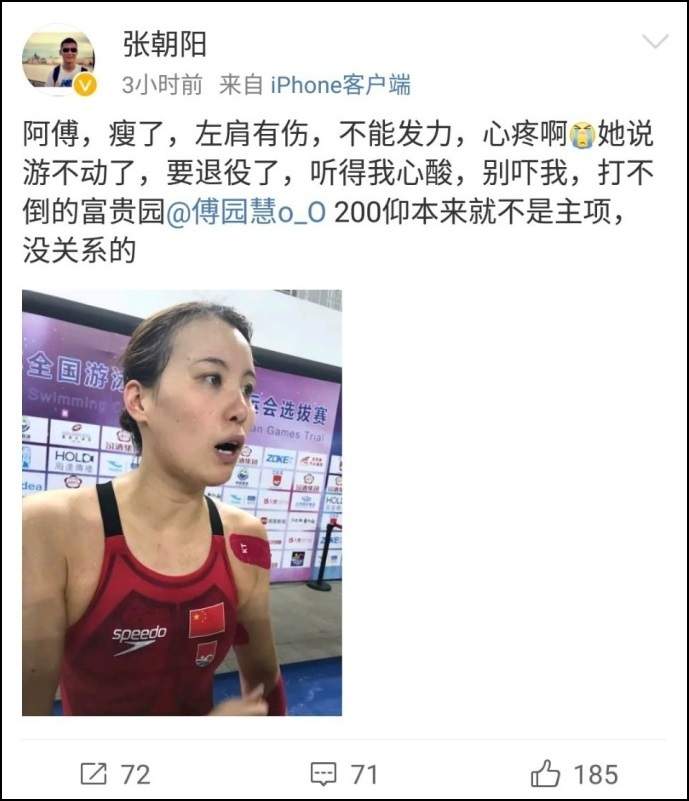 為什麼一個高水平運動員會有這樣的想法,傅園慧言語中有些抱怨:“不行的話就會退役,請不起隊醫沒辦法,遲早要面對的,每個運動員都有這一天。”