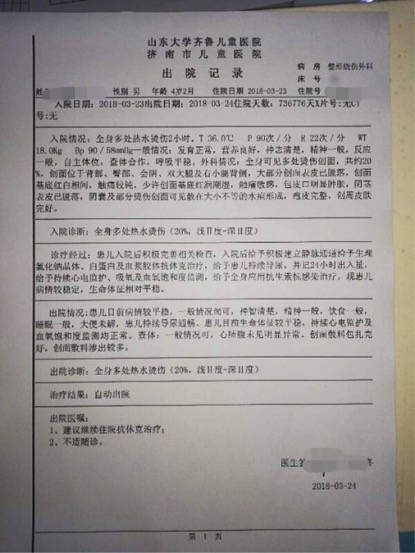 濟南市兒童醫院出院記錄顯示全身可見多處燙傷創面,共約20%。 受訪者供圖