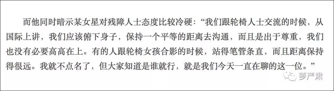 五、視頻採訪就到這兒,但網易娛樂的文字版還有一截,是李萌在內涵楊冪“對殘障人士態度比較冷硬”。