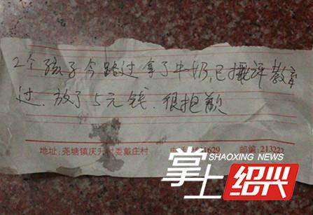 據掌上紹興12日報道,“兩個孩子今路過拿了牛奶,已批評教育過,放了5元錢,抱歉。”這兩天,一張留言條在微信朋友圈被大量分享,並得到網友一致點贊。“小孩子的這種行為我們能理解,但孩子母親的做法值得點贊,反正我們一家都被感動了,這是教育孩子的最好事例。”昨天,諸暨陳阿姨講述了留言條背後的温暖故事。