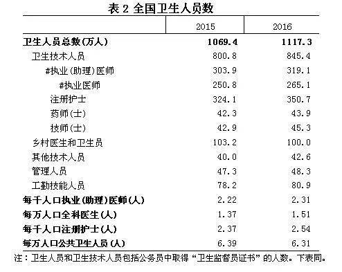 按照國家衞計委發佈的《2016年我國衞生和計劃生育事業發展統計公報》的數據:我國2016年共有執業(助理)醫師319.1萬人;鄉村醫生和衞生員100.0萬人,2016年,每千人口執業(助理)醫師2.31人,每萬人口全科醫生1.51人。