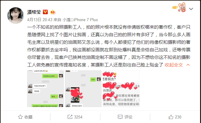 不過,時隔2個小時之後,潘綾瑩再次發微博稱:“一個不知名的拍照攝影工人,拍的照片根本就沒有申請版權哪來的著作權,客户只是隨便網上找了個圖片讓我畫,還真以為自己拍的照片有多好了,當今那麼多人畫毛主席以及明星們的油畫那又怎麼説,每個人都侵犯了他們的肖像權和攝影師的著作權都要抓去坐牢嗎,我這畫都沒畫就在那到處爆料真是會給自己加戲,還等傳票你儘管去告,現客户已換其他油畫定製不畫這幅了,因為不想給你這不知名的攝影工人做免費的宣傳提高知名度,某攝影工人還是別往自己臉上貼金了”