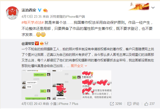 不過,對於潘綾瑩發微博表示的攝影師拍的照片根本就沒有申請版權哪來的著作權這一點,各路官方微博都忍不住轉發普法了。
