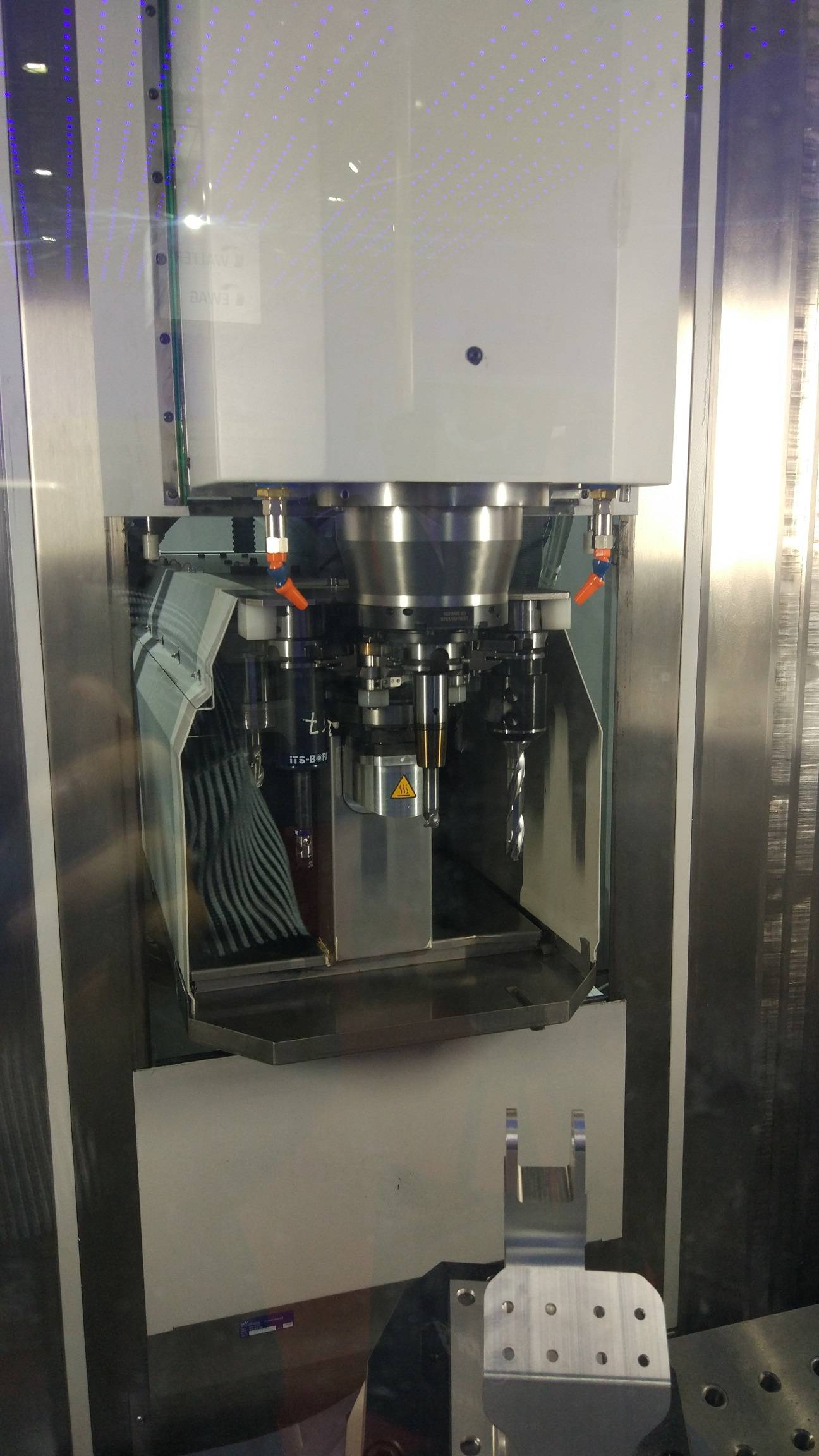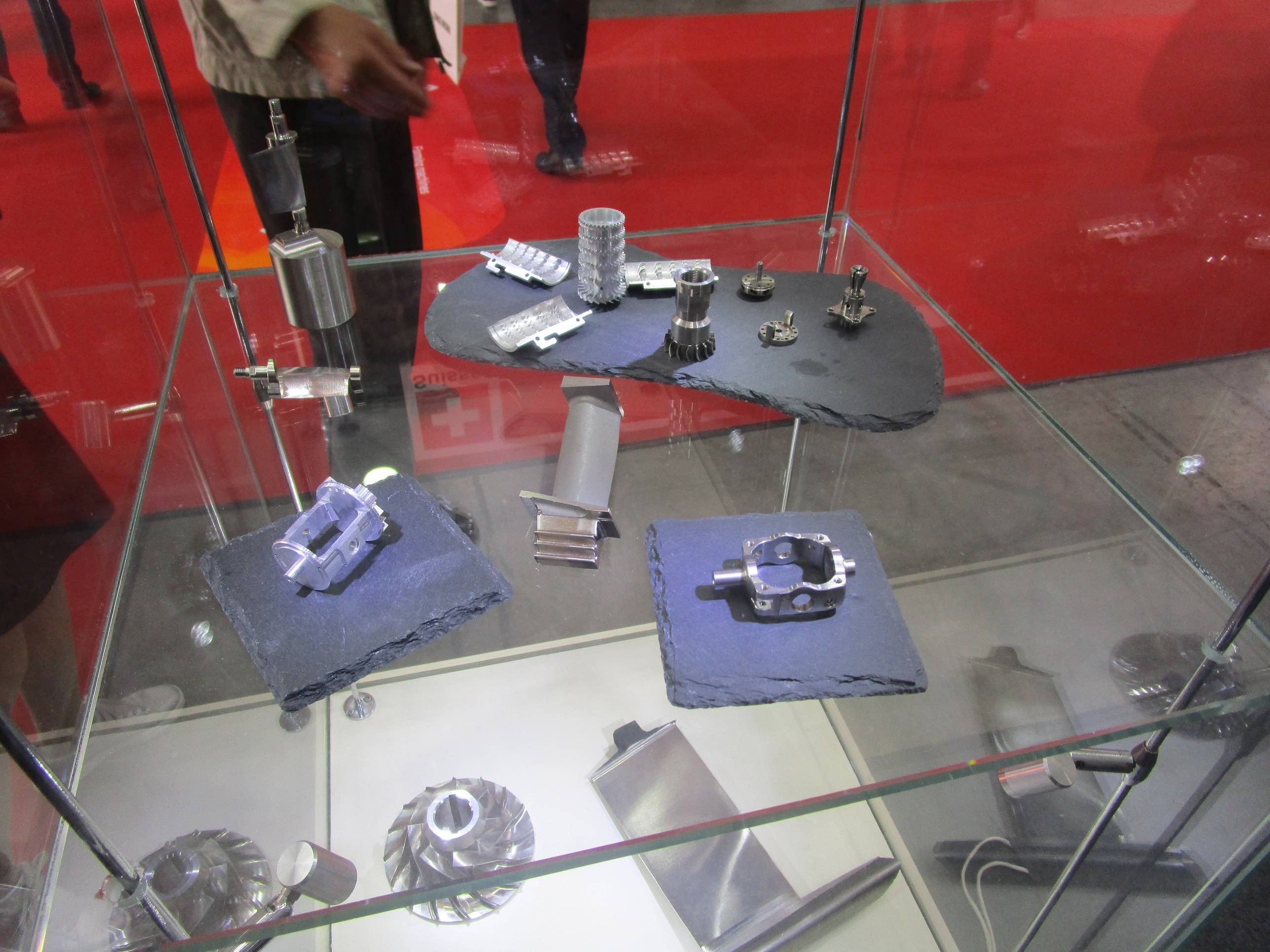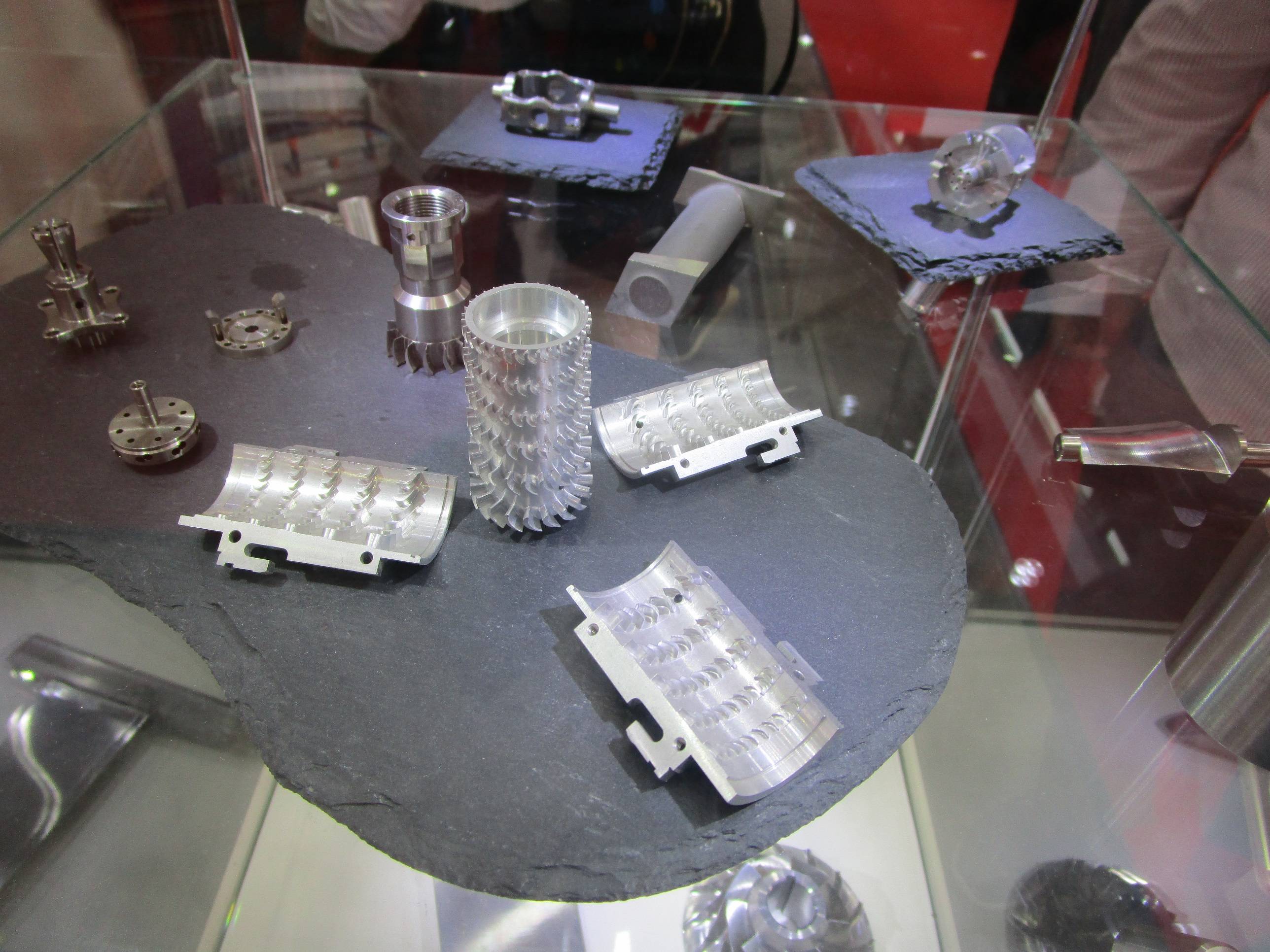 S181的數控系統默認配置是發那科,但是如果想充分發揮出這台設備的強大功能,最好還是加錢讓斯達拉格把系統換成西門子840D吧,畢竟斯達拉格的優化算法就是基於更加開放,對複雜加工適應能力更強的840D系統開發的(我真的不是在給西門子做廣告)。 下面是這台設備加工的鐘表、珠寶和慣性導航設備零部件,從上往下第二層展櫃裏最高處就是陀螺儀支架(後面那位大姐對不住了)。