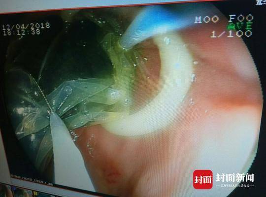 在實施第二次無痛胃鏡時,他們先包裹住異物,再應用鉗道外及鉗道內雙圈套法將其順着食道的方向拉出體外。整個手術過程只花了十分鐘。