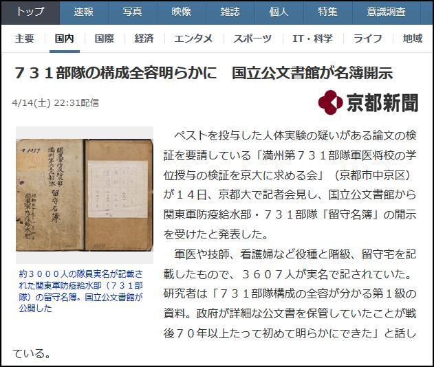 據日本媒體《京都新聞》報道,4月14日,日本國立公文書館在京都大學舉行記者會,首次公開了臭名昭著的原日本731部隊(關東軍防疫給水部)名冊信息,留下真實姓名可考的共計3607人,其中軍醫52人,技師49人,僱員1275人,衞生兵1117人。