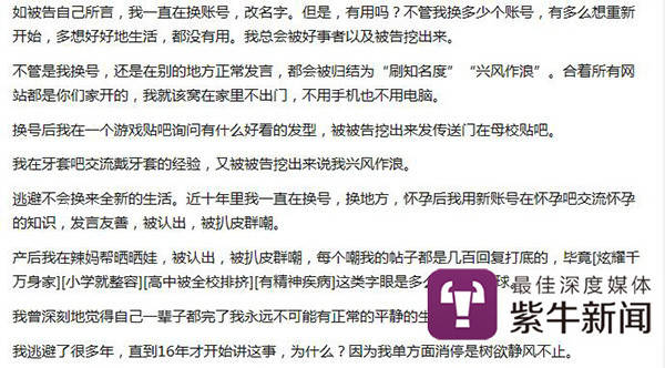 然而,噩夢並未就此終結。在上大學後,有人到王女士所在大學論壇宣揚她的“過去”,指名道姓地攻擊。後來,她玩微博會受到攻擊,有孩子後上母嬰網站被攻擊,玩知乎照樣被攻擊。無論在哪裏,總有認識她的人不厭其煩地到處複製粘貼她過去的經歷。有人看到某個色情明星像王女士,直接就發帖稱她下海當了女優。