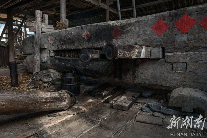 古法榨油 木槽裏包裹着油料餅,用橫向的木楔擠緊