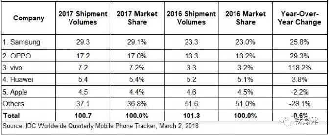 根據2月份IDC發佈的數據,2017年國內手機市場銷量排名前5品牌是華為、OPPO、vivo、小米、蘋果,這5家佔了總體市場份額的76%左右。2017年全球出貨量,華為、OPPO、小米衝進了全球TOP5。