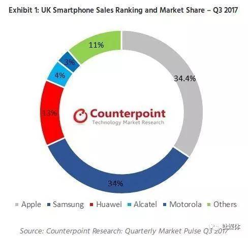 在歐洲,最大的手機市場是英國。根據數據研究公司Counterpoint公佈的數據,2017年第三季度英國智能手機的市場份額,排名前五的分別是蘋果、三星、華為、阿爾卡特(TCL)、摩托羅拉,“華米OV”只有華為名列其中,市場份額在13%左右,其中華為P10最受歡迎。
