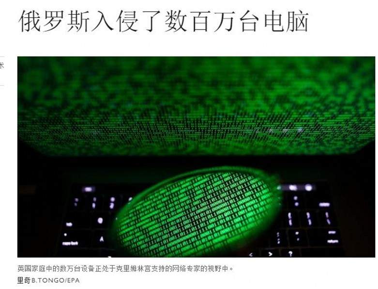 泰晤士報則説,昨天,英美兩國警告稱,俄羅斯發動的一場全球性黑客攻擊針對數百萬台計算機,目的是監視各國政府,併為攻擊基礎設施奠定基礎。