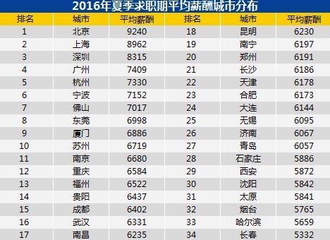 再來看看2016年夏季求職期平均薪酬城市分佈,北上廣深卻是高居榜首,而且基本集中於沿海東部城市,根本沒有宜昌的影子。