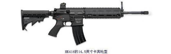 HK416是由黑克勒-科赫(Heckler & Koch,經常縮寫為H&K或HK)以HK G36突擊步槍的氣動系統在M4卡賓槍的設計上重新改造而成,現已成為完整的突擊步槍推出,亦可以換裝氣動系統、上機匣組件、槍管和彈匣來改造AR-15系列的組合而成。
