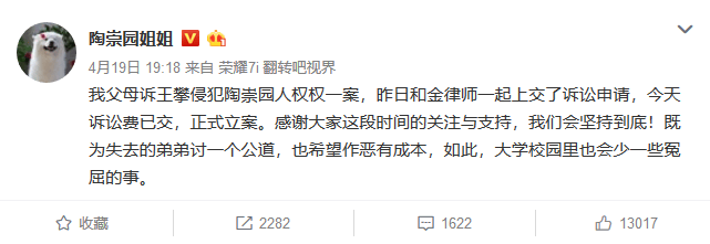 4月19日晚,陶崇園家屬的微博@陶崇園姐姐稱,我父母訴王攀侵犯陶崇園人權權一案,已向法院提交訴訟申請,當天訴訟費已交,正式立案。