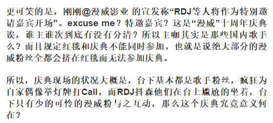 現場主持人完全無視了“漫威十週年”的巨大標題,而一味地把本土明星們邀請上前,而幾個漫威直系演員則默默地站在一旁,等待主持人需要他們進行互動的時機。