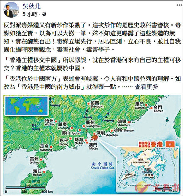 據文匯報20日報道,有媒體披露今年曆史課本送審報告,其中多本教科書稿中描述香港及內地關係的字眼被評為“措辭不恰當”,包括“中國堅持收回香港主權”、“香港位於中國南方”等,反對派即借題發揮,竟聲稱這是“篡改教科書”。