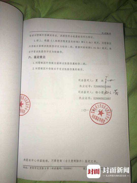 根據貴州醫科大學法醫司法鑑定中心作出的司法鑑定,劉雪琪的傷情被鑑定為輕傷二級。