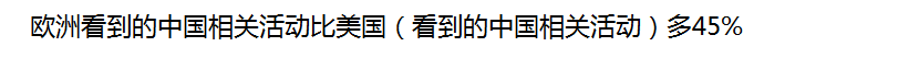 於是可以組合成:根據可查數據,按美元計算,在同一時期,歐洲方面可以看到與中國相關的活動比美國的要多45%。
