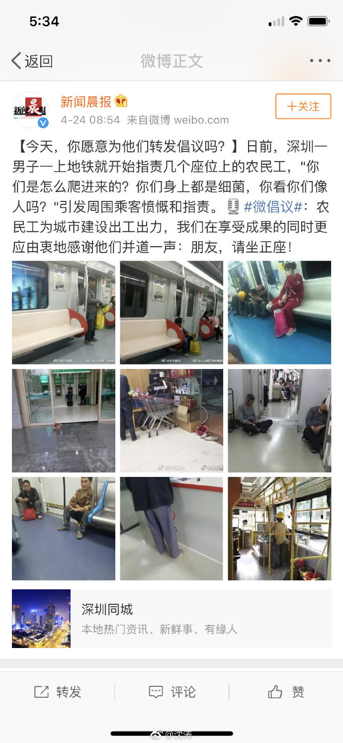 【今天,你願意為他們轉發倡議嗎?】日前,深圳一男子一上地鐵就開始指責幾個座位上的農民工,“你們是怎麼爬進來的?你們身上都是細菌,你看你們像人嗎?“引發周圍乘客憤慨和指責。[話筒]#微倡議#:農民工為城市建設出工出力,我們在享受成果的同時更應由衷地感謝他們並道一聲:朋友,請坐正座!