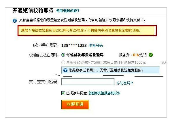 (b)、向葉龐濤推送短信校驗服務產品,系搞錯訂製和收費對像,犯顛覆性錯誤。 根據支付寶制定和公示的規則,支付寶快捷用户成為數字證書用户後,無需開通短信校驗服務產品,可免費享受短信校驗與通知,請看電腦截屏劃線部分: