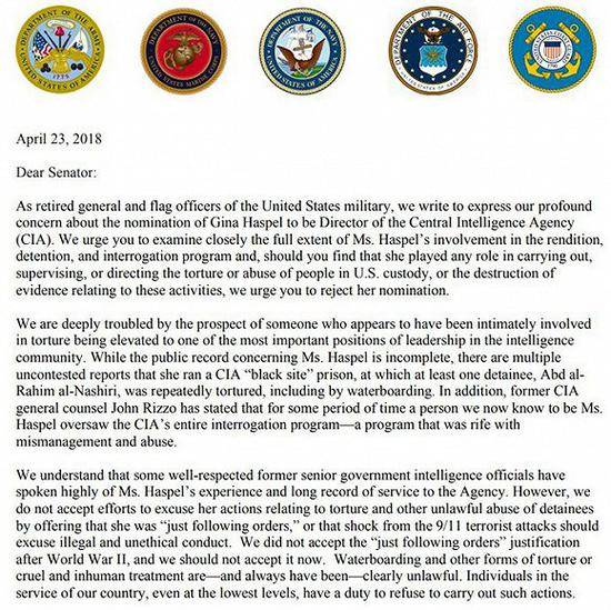 信中寫道:“如果讓一個與我們國家歷史中這樣黑暗一頁有如此密切關係的人成為下一任CIA局長,將給外界發出一個糟糕的信號。”