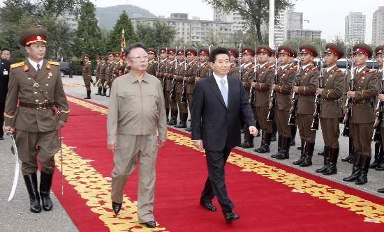 2007年10月2日,盧武鉉與金正日一起檢閲了朝鮮人民軍名譽衞兵隊,兩人只握手不擁抱。