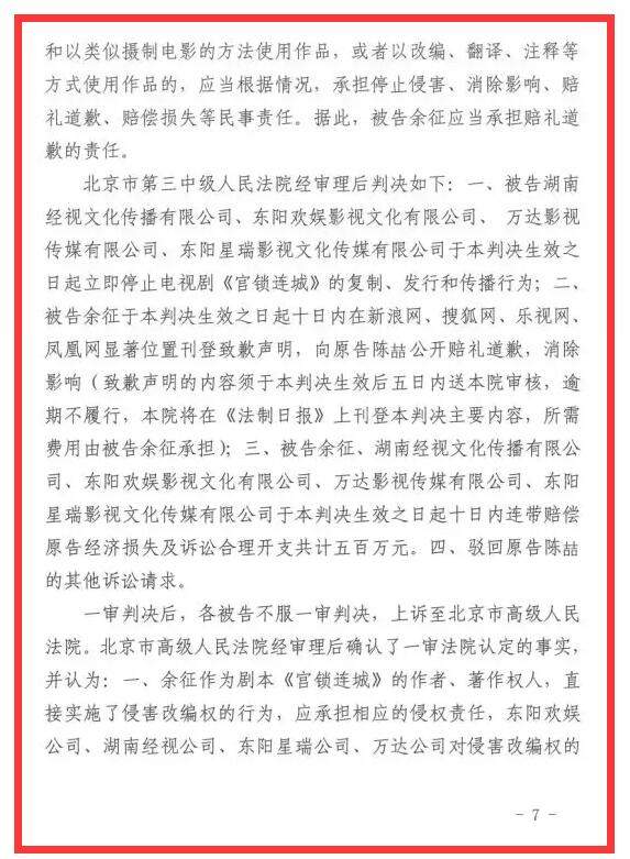 北京法院網官方微信公眾號“京法網事”26日報道,適值第18個世界知識產權日,北京市第三中級人民法院今日強制執行陳喆(瓊瑤)與餘徵(於正)侵害著作權糾紛一案,於本日刊行的《法制日報》第四版對該案相關判決的主要內容予以刊登。