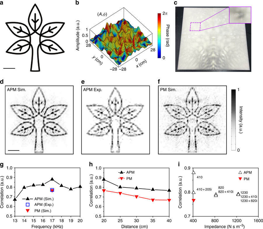 圖1 新方法及傳統方法產生的高複雜聲全息的計算結果對比。(a,c) 為目標圖案(北大樓照片及南大校徽圖案), (b,e)為APM方法得到的結果,(c,f)為傳統PM方法得到的結果。