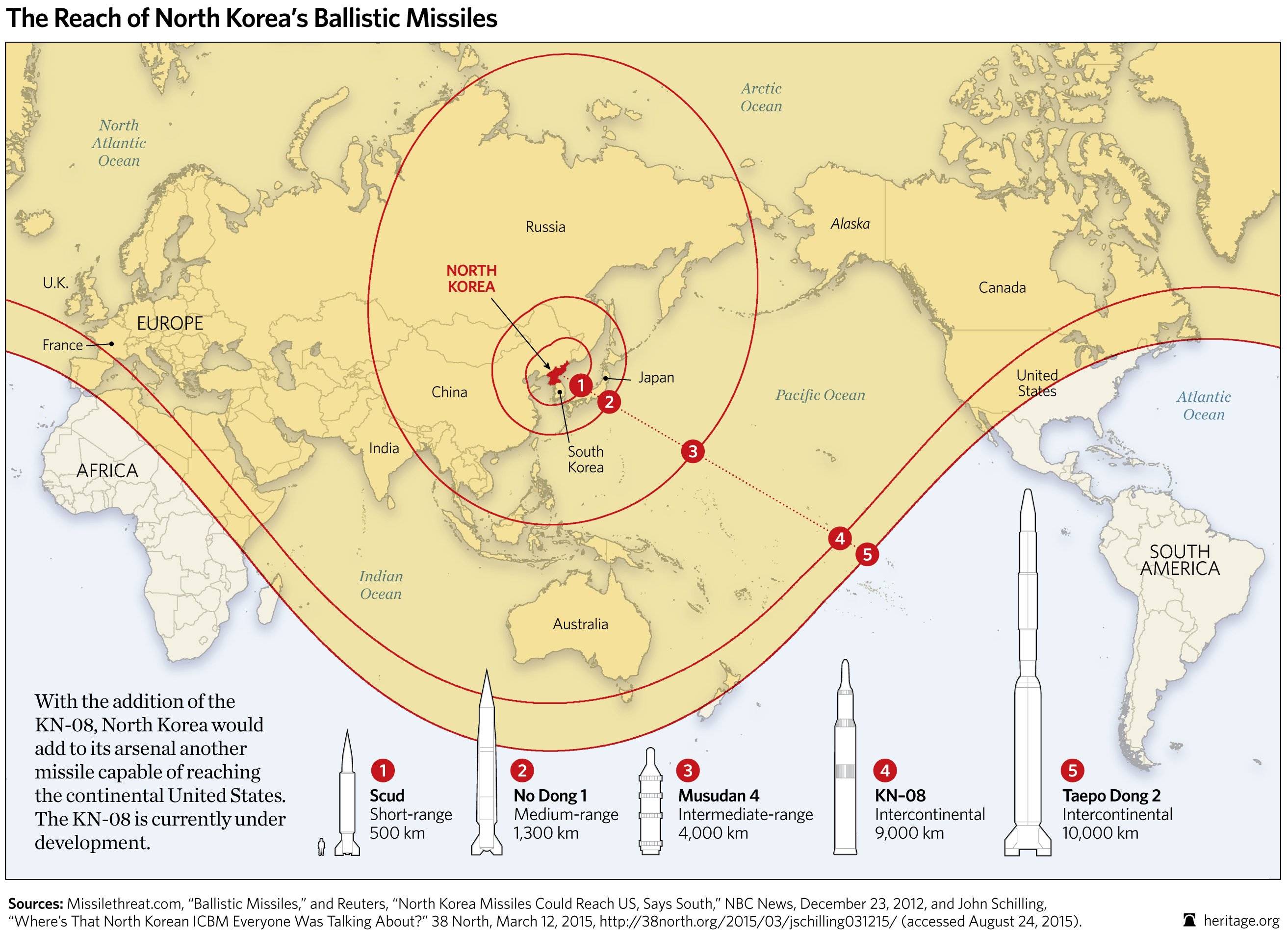 借用一張外媒的舊圖,當時朝鮮的洲際導彈還是傳説中的KN-8和大浦洞-2。據專家分析,火星-15雖然全射程13000KM,但增加核荷載後會下降至8000KM左右。可參看上圖9000和10000KM的攻擊範圍