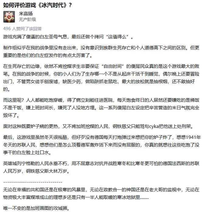 在通關遊戲之後,筆者不由想到七十多年前英雄的列寧格勒的軍民。他們在德國法西斯的圍困之中,在嚴寒之中,缺衣少糧。他們沒有抗議,他們沒有搞破壞,他們沒有分裂,他們每天忍受着嚴寒與飢餓在前線挖着戰壕,在工廠里加班加點,在冰凍的海面上頂着法西斯的炮火運輸物資。他們並沒有抱怨,他們同仇敵愾,堅持了1400多天,迎來了德國法西斯的退卻,迎來了最後的勝利。如果問他們付出了那麼大的代價,這一切值得麼?英雄的列寧格勒人民會回答:值得!
