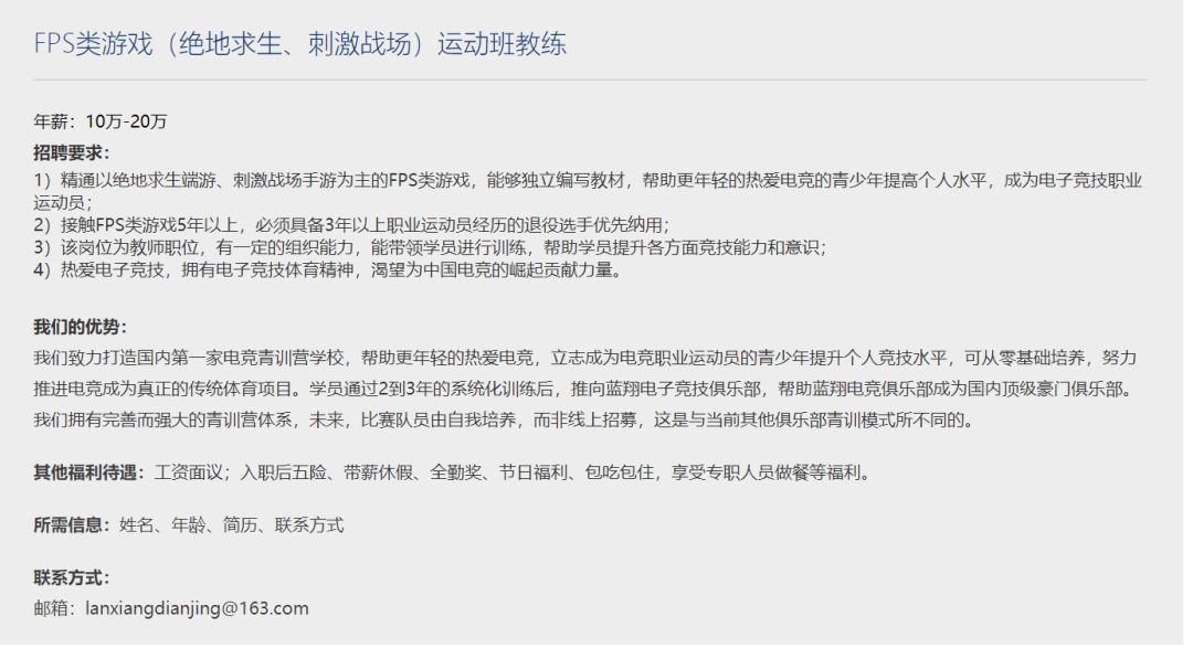 在藍翔官網的招聘頁面上,可以看到俱樂部分析師、選手、教練以及管理班講師、班主任的招聘信息。講師的任職要求十分簡單,只需在電競館等機構擔任店長2年以上,瞭解行業且具備編寫教材能力即可。通常高校類電競科目的教師都是資深從業者或退役選手。