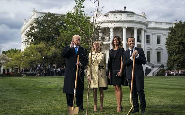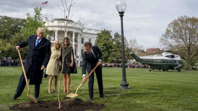 馬克龍夫婦與唐納德·特朗普夫婦一起,在白宮南草坪的一塊草地上共同隆重栽植橡樹苗。