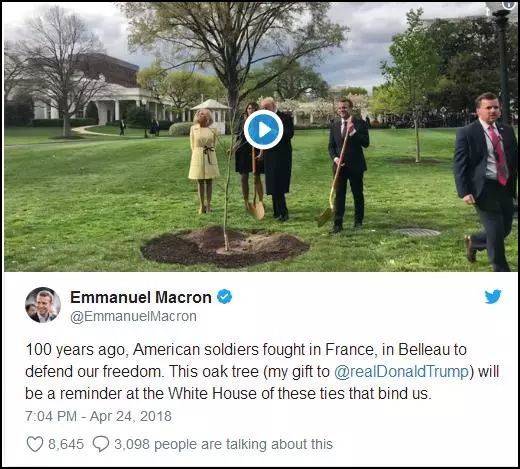 馬克龍還在推特上寫道,“100年前,美國士兵為捍衞我們的獨立而在法國貝洛林苑浴血奮戰。這株栽植於白宮最中心的橡樹苗將是關於把法美兩國連接起來的關係的提醒”。