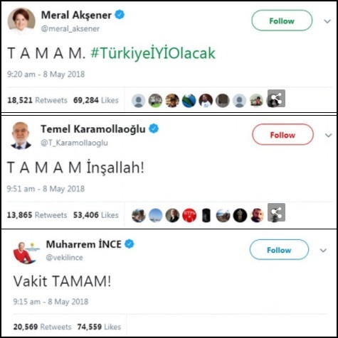 這些被視為是埃爾多安在總統大選中的主要競爭對手也加入到轉發熱潮中,穆哈雷姆·因吉僅發文表示“時間到了。#夠了#”,暗示埃爾多安的執政應該到此為止。路透社還注意到,幾位主要競爭對手的“夠了”推文一起獲得了超過10,000次的轉發。
