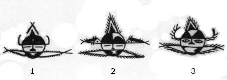 彩陶人面紋(1、2為半坡出土,3為姜寨出土)