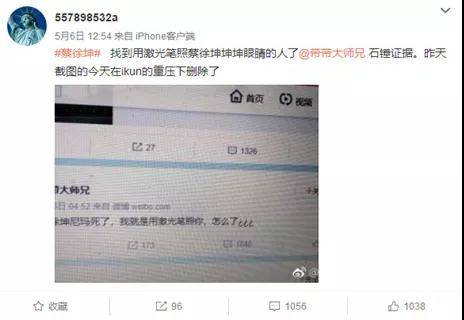 他們在相關微博下放出消息:在台下用激光筆傷人的就是帶帶大師兄!並且製作了一系列辱罵蔡徐坤的截圖作為實錘,在網絡上廣為流傳。