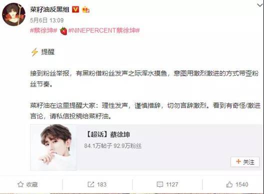 而作為這次話題的核心人物,蔡徐坤與帶帶大師兄本人的微博都沒有為此過多發聲。直到真相浮出水面後,雙方粉絲才在各自話題主持人的帶領下鳴金收兵。
